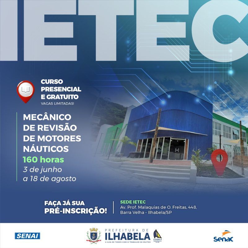 Quer se destacar na área náutica? A Ilhabela Escola Técnica (IETEC), em parceria com a Secretaria de Desenvolvimento Econômico e Turismo, tem uma oportunidade imperdível para você! Estão abertas as pré-inscrições para o curso presencial de Mecânico de Revisão de Motores Náuticos, a porta de entrada para novas habilidades e oportunidades no setor.