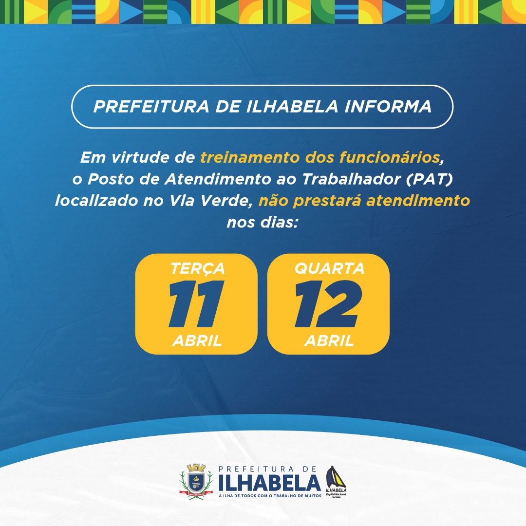 A Prefeitura de Ilhabela informa que o Posto de Atendimento ao Trabalhador (PAT) localizado no Via Verde não realizará atendimentos nos dias 11 e 12 de abril (terça-feira e quarta-feira). Nas datas mencionadas, os funcionários do setor passarão por treinamento, visando sempre o melhor atendimento à população.