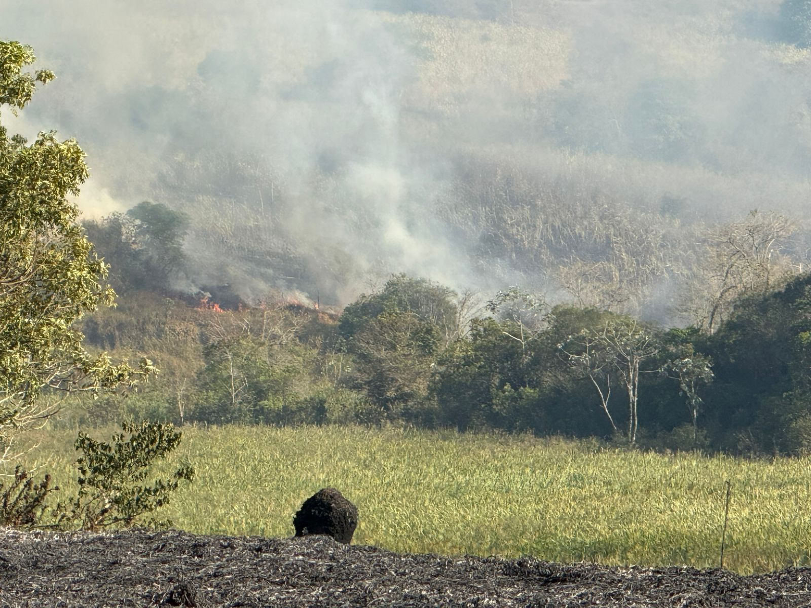 Dos três focos ativos de incêndio, o que mais preocupa é que está próximo a uma plantação de cana. Caso a plantação seja atingida, a tendência é que o fogo se alastre muito rápido.